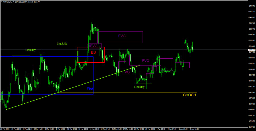 На дневном ТФ продолжается формирование нисходящей тенденции и коррекции против нее. Ключевым паттерном на продажу выступал и выступает «медвежий» Order-block на недельном ТФ. Как мы и предупреждали, движение, спровоцированное этим сигналом, может быть сильным и длительным. После его формирования эфир уже подешевел на 55% или на 2 500$. В ближайшее эфир может продолжить слабую восходящую коррекцию, но любая коррекция рано или поздно заканчивается. На 4-часовом ТФ эфир весьма неплохо отработал все последние FVG, но движения по-прежнему слабые, коррекционные. По биткоину на 4-часовом ТФ сохраняется флэт, и это ключевой сейчас фактор для всего крипторынка. Девиация верхней границы бокового канала указывает на весьма вероятное падение биткоина в ближайшее время. Следовательно, и эфир может находиться в падении в ближайшие дни.Пояснения к иллюстрациям: