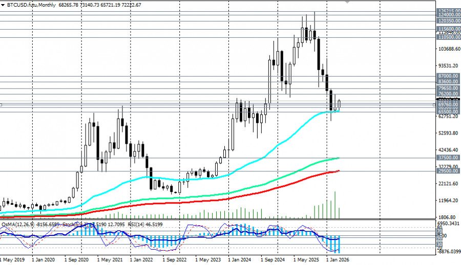 Цели: пробой 73140.00 откроет дорогу к 74000.00, затем к 76000.00-76200.00 и далее – к важному среднесрочному уровню сопротивления 79650.00 (ЕМА144 на дневном графике). В случае усиления позитивной динамики и пробое ключевой зоны сопротивления 83600.00 (ЕМА200 на дневном графике)-87000.00 (ЕМА50 на недельном графике) BTC/USD возвращается в зону среднесрочного бычьего рынка и продолжает развивать долгосрочную восходящую динамику. В альтернативном сценарии сигналом для новых продаж может стать пробой сегодняшнего минимума 71425.00, а затем уровня поддержки 70700.00 (ЕМА50 на дневном графике). Дальнейшее снижение и пробой 69000.00-68300.00 (ЕМА200 на недельном графике) станет возможным при: