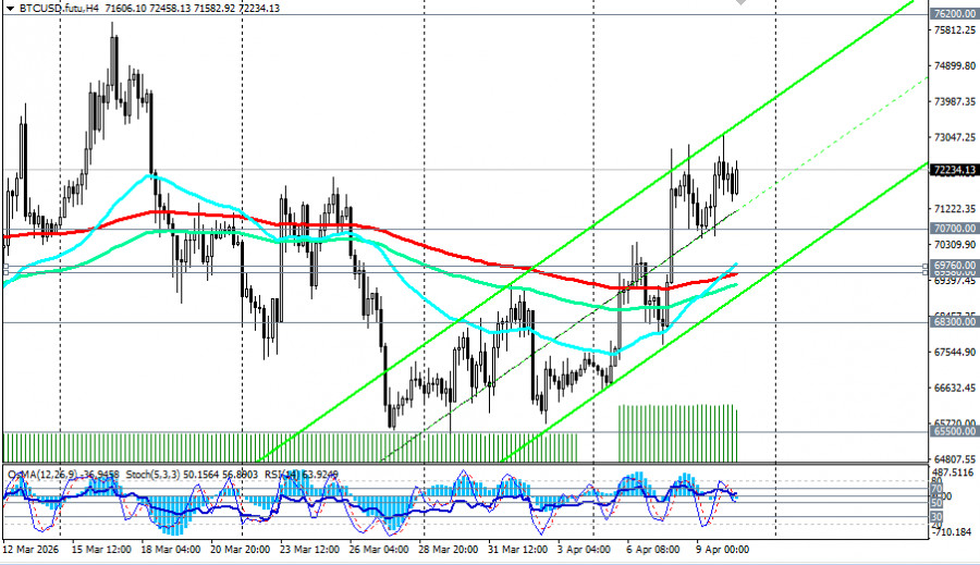 Биткоин остаётся заложником геополитической ситуации и будет колебаться в указанном диапазоне до появления чётких сигналов о долгосрочном мире или возвращении к эскалации. Перемирие (пусть и хрупкое) снизило геополитические риски, а институциональный интерес достиг нового уровня. С другой стороны, индекс «страха и жадности» остаётся на уровне «страха», отметили мы в нашем сегодняшнем фундаментальном анализе и обзоре «Крипторынок (BTC): перемирие против хрупкости». С технической точки зрения, BTC/USD сохраняет краткосрочный бычий импульс, торгуясь выше важных краткосрочных уровней поддержки 69760.00 (ЕМА200 на 1-часовом графике), 69580.00 (ЕМА200 на 4-часовом графике). На дневном графике технические индикаторы также находятся на стороне покупателей: 14-дневный RSI - с растущим значением выше срединной линии 50, OsMA рисует растущие гистограммы, а Стохастик двигается в зоне перекупленности без признаков разворота. При этом цена остается выше 50-дневной ЕМА (70700.00), претендуя на позитивное закрытие недели (с ожидаемым приростом примерно в 6,7%). Следующее сильное сопротивление находится в зоне 76000.00 - 76200.00 (ЕМА144 на недельном графике), которую цене необходимо преодолеть для развития успеха. Риски же падения усилятся в случае пробоя поддержки на уровне 70700.00. Самым ранним сигналом для новых длинных позиций может стать пробой сегодняшнего максимума (он же – максимум недели) 73140.00. Бычий сценарий реализуется при: