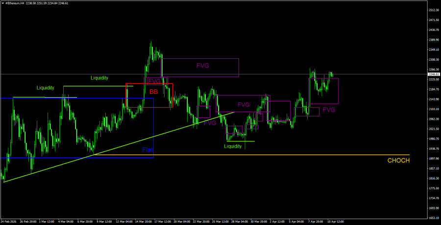 Эфир продолжает находиться в непонятном движении на 4-часовом ТФ и в восходящей коррекции на дневном. Сразу же стоит отметить, что движения эфира практически на 100% идентичны движениям биткоина. А значит обе криптовалюты по-прежнему демонстрируют крайне высокую степень корреляции. Так как биткоин толком не растет и не падает, то и эфир показывает точно такую же динамику. Какой выход из этой ситуации, если коррекция длится уже два месяца? Во-первых, следует помнить, что эфир будет двигаться ровно в ту сторону, в которую будет двигаться биткоин. Во-вторых, биткоин по-прежнему нацелен на восходящую коррекцию. В-третьих, и по биткоину, и по эфиру имеются пулы ликвидности, выраженные линиями тренда на дневном ТФ, а мы по-прежнему считаем, что цена обязательно сходит ниже этих линий тренда. В-четвертых, последние «медвежьи» FVG, сформированные в рамках последнего витка нисходящего тренда, так и не были отработаны. А именно они выступают ключевыми областями POI. Вчера в Штатах был опубликован очередной важный отчет, а криптовалютный рынок в очередной раз показал, что макроэкономическая статистика его не интересует. Инфляция в США выросла по итогам марта до 3,3%, а на криптовалютном рынке в ближайшее время наверняка начнутся разговоры о статусе защиты от высокой инфляции у основных криптовалют. Следует отметить, что в последние пять дней растет и эфир, и биткоин, что совпадает с падением американской валюты. А падение американской валюты началось, когда на Ближнем Востоке «запахло» перемирием. Эфемерное перемирие, которого фактически пока нет, пока очень слабо влияет на нефтяные котировки, но валютный и криптовалютный рынок отвечают сдержанными покупками.