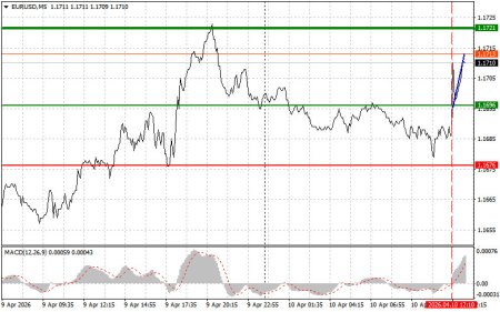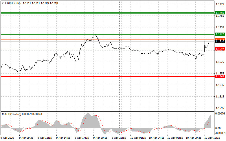 Разбор сделок и советы по торговле европейской валютойТест цены 1.1696 пришелся на момент, когда индикатор MACD только начинал движение вверх от нулевой отметки, что стало подтверждением правильной точки входа на покупку евро. В результате пара выросла на 17 пунктов.Грядущие публикации сведений об инфляции в Соединенных Штатах, появившихся после начала военного конфликта между США, Израилем и Ираном, привлекут повышенное внимание. Ожидается представление данных по индексу потребительских цен за март, а также по его версии, не учитывающей продукты питания и энергоносители. Кроме того, будут обнародованы индекс потребительских настроений от Мичиганского университета и информация о будущих инфляционных ожиданиях. Особое место займет анализ базового индекса потребительских цен, который, исключая из расчетов волатильные статьи расходов, такие как продукты и энергоносители, что крайне важно в текущей геополитической обстановке. Не менее значимыми станут результаты опроса Мичиганского университета, отражающие восприятие потребителями текущего экономического состояния и их прогнозы относительно будущей динамики цен. Только очень сильно расхождение с прогнозами сумеет навредить восходящему тренду EUR/USD в конце недели, так как все сейчас сосредоточены на мирных переговорах по ситуации на Ближнем Востоке.Что касается внутридневной стратегии, то больше буду опираться на реализацию сценариев №1 и №2.Сигнал на покупкуСценарий №1: сегодня покупать евро можно при достижении цены в районе 1.1722 (зеленая линия на графике) с целью роста к уровню 1.1759. В точке 1.1759 планирую выходить из рынка, также продавать евро в обратную сторону в расчете на движение в 30-35 пунктов от точки входа. Рассчитывать на рост евро сегодня можно только после очень слабой статистики по США. Важно! Перед покупкой убедитесь в том, что индикатор MACD находится выше нулевой отметки и только начинает свой рост от нее.Сценарий №2: покупать евро сегодня также собираюсь в случае двух подряд тестов цены 1.1697 в момент, когда индикатор MACD будет находиться в области перепроданности. Это ограничит нисходящий потенциал пары и приведет к обратному развороту рынка вверх. Можно ожидать рост к противоположным уровням 1.1722 и 1.1759.Сигнал на продажуСценарий №1: продавать евро планирую после достижения уровня 1.1697 (красная линия на графике). Целью будет уровень 1.1649, где собираюсь выходить из рынка и покупать сразу в обратную сторону (расчет на движение в 20-25 пунктов в обратную сторону от уровня). Давление на пару сегодня вернется при сильной статистике. Важно! Перед продажей убедитесь в том, что индикатор MACD находится ниже нулевой отметки и только начинает свое снижение от нее.Сценарий №2: продавать евро сегодня также собираюсь в случае двух подряд тестов цены 1.1722 в момент, когда индикатор MACD будет находиться в области перекупленности. Это ограничит восходящий потенциал пары и приведет к обратному развороту рынка вниз. Можно ожидать снижения к противоположному уровню 1.1697 и 1.1649.Что на графике:Тонкая зеленая линия – цена входа, по которой можно покупать торговый инструмент;Толстая зеленая линия – предположительная цена, где можно расставлять Take Profit или самостоятельно фиксировать прибыль, так как выше этого уровня дальнейший рост маловероятен;Тонкая красная линия – цена входа, по которой