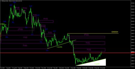 Эфир на дневном ТФ продолжает формирование нисходящей тенденции и коррекции. В данное время на дневном ТФ имеется три «медвежьих» паттерна, все – FVG. Ближайший FVG располагается в области 2 480$ – 2 630$, и именно он представляет интерес для трейдеров, и именно он может быть отработан уже в ближайшее время. В то же время биткоин может отработать в ближайшие дни свой ближайший «медвежий» FVG. Таким образом, по обеим криптовалютам могут быть сформированы сигналы на продажу после двух месяцев коррекции. Линия CHOCH проходит по уровню 3 395$ – последний LH(Lower High). До тех пор, пока цена находится ниже нее, нисходящий тренд сохраняется.Анализ ETH/USD 4Н.