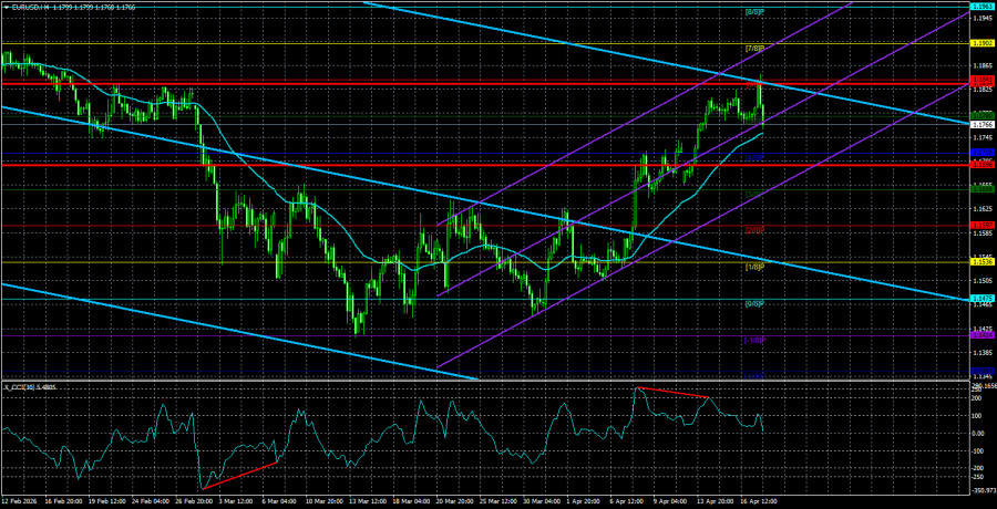Валютная пара EUR/USD в течение последних двух недель торговалась с повышением, но, кажется, теперь уже сказка европейской валюты подходит к концу. В последние недели рынок верил в то, что переговоры между Вашингтоном и Тегераном завершатся хотя бы открытием Ормузского пролива и завершением боевых действий. Ормузский пролив действительно был открыт в пятницу. Как выяснилось позже, только для того, чтобы оказаться снова закрытым в субботу. На этот раз США и Иран не смогли договориться об американской блокаде пролива. Иран сначала заявил, что блокада будет снята, так как Израиль и Ливан сумели договориться о прекращении огня на 10 дней. Однако чуть позже стало известно, что Иран свою блокаду снял, а США – нет. Поэтому иранские порты остались заблокированными, что, конечно же, не устроило Тегеран. По состоянию на текущий момент пролив вновь заблокирован, а цены на нефть уже сегодня могут вновь поползти вверх. Вместе с курсом американской валюты. Как мы уже говорили много раз, достичь всеобъемлющего соглашения Вашингтону и Тегерану будет крайне тяжело. Ключевым вопросом был и остается вопрос ядерной энергетики. В воскресение стало известно, что Иран в очередной раз отказался от вывоза всего обогащенного урана за пределы своей территории, поэтому мы даже не понимаем, о чем ведут переговоры участники конфликта? Очевидно, что Иран не откажется от ядерной энергетики и вооружений. Чего хочет добиться Трамп на этих переговорах – неясно. Из-за нового закрытия Ормуза и нового провала в переговорах доллар на новой неделе может вновь перейти в рост. А от этих событий будут зависеть практически все остальные. К примеру, мы практически уверены в том, что макроэкономические публикации вновь не будут иметь никакого значения для трейдеров. Поэтому даже рассматривать их не будем. В понедельник и среду должны состояться выступления председателя ЕЦБ Кристин Лагард, чья риторика в отношении монетарной политики вновь может измениться. Напомним, что на прошлой неделе госпожа Лагард сообщила об отсутствии необходимости спешить с повышением ставок, так как обстановка на Ближнем Востоке может наладиться. Однако мы пока не видим, что может наладиться в ближайшее время. Прекращение огня – это позитивный факт, но сколько оно будет продолжаться, если стороны не могут найти точки соприкосновения по ключевым вопросам? Если соглашение не будет подписано, а Ормузский пролив останется заблокированным, то снижения цен на нефть можно не ждать. Следовательно, инфляция по всему миру будет продолжать расти. И в этом случае ЕЦБ может вновь изменить настрой на более «ястребиный». Таким образом, выступления Лагард мы считаем наиболее значимыми событиями в Евросоюзе. Однако даже без выступлений Лагард спрос на валюту США может вновь начать расти. Просто потому, что наиболее позитивные ожидания рынка по Ближнему Востоку не подтверждаются на практике. Средняя волатильность валютной пары EUR/USD за последние 5 торговых дней по состоянию на 20 апреля составляет 68 пунктов и характеризуется, как «средняя». Мы ожидаем движение пары между уровнями 1,1698 и 1,1834 в понедельник. Старший канал линейной регрессии развернулся вниз, что указывает на смену тренда на нисходящий. Однако фактически сейчас может возобновиться восходящий тренд 2025 года. Индикатор CCI заходил в область перекупл