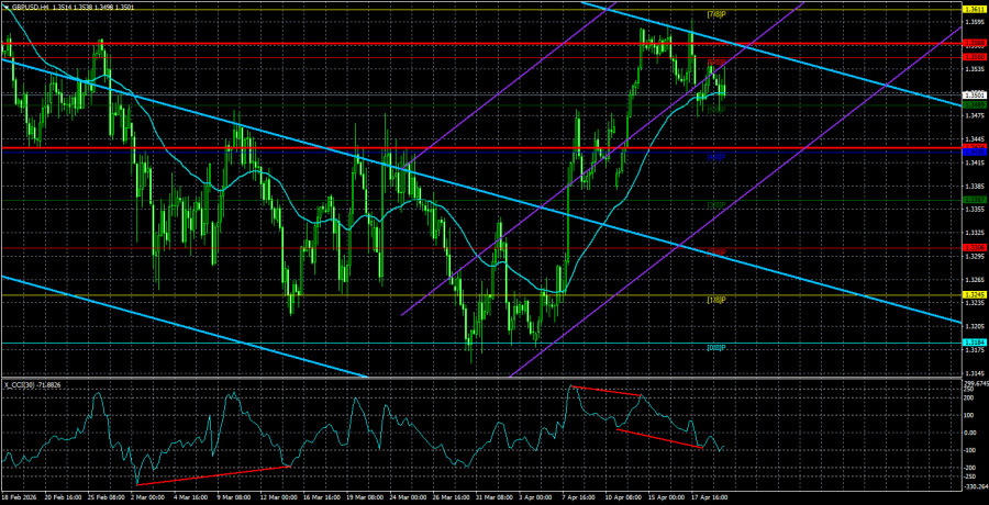 Валютная пара GBP/USD в течение вторника также торговалась крайне спокойно, несмотря на то, что в Великобритании было опубликовано несколько важных и резонансных отчетов. Начать следует с отчета по безработице, который неожиданно для многих снизился с 5,2% до 4,9% при прогнозах 5,2%. Согласитесь, такое снижение одного из главных макроэкономических показателей должно было спровоцировать рост британской валюты. И спровоцировало, если бы не одно «но» – рынок уже два месяца не обращает никакого внимания на макроэкономический фон. И не стоит искать в самом отчете «ложку дегтя». Ведь это далеко не первый случай, когда никакой реакция рынка на важнейшие данные отсутствует. Если отчет оказался не таким уж сильным, как кажется, глядя на цифры, то фунт должен был упасть сразу после публикации. Если отчет все же хорош, британская валюта должна была вырасти. Однако мы не увидели ни того, ни другого, а умеренный рост американской валюты является чисто коррекционным. Пара GBP/USD также росла две недели подряд, поэтому небольшой откат не повредит. Хоть влияние геополитики ослабевает, рынок по-прежнему не торопится отрабатывать стандартные фундамент и макроэкономику. В самом ближайшем будущем состоятся заседания Банка Англии и ФРС, и Британский регулятор еще месяц назад оказался настроен гораздо более «по-ястребиному», чем Американский регулятор. Однако тогда доллар продолжал расти, несмотря ни на что, кроме геополитики. Сейчас же рынок находится в подвешенном состоянии, так как неясно даже, пройдет ли на этой неделе новый раунд переговоров между Тегераном и Вашингтоном. Джей Ди Венс, может быть, уже вылетел и даже прилетел в Исламабад, но что мешает Ирану еще раз отказаться от встречи? Тем более, что по различной информации, в Тегеране нет единого мнения в отношении переговоров с США. Корпус стражей исламской революции настаивает на жесткой позиции: никаких переговоров, пока Вашингтон не разблокирует иранские порты. А вот новый верховный лидер Ирана Моджтаб Хаменеи согласен на встречу, чтобы как можно быстрее урегулировать конфликт. Кто в итоге правит страной и кто принимает решения, также остается непонятным. Что касается самих переговоров, то мы остаемся достаточно скептическими в отношении них. Мы по-прежнему не понимаем, о чем стороны собирают договариваться, если никто не готов уступать по наиболее важным пунктам. Единственный шанс для всего мира – заключение ядерной сделки по типу той, которая уже действовала между странами десять лет назад. То есть на ядерные объекты Ирана будут допущены представители международных организаций с целью установления контроля над обогащенным ураном. Однако согласился ли Тегеран на новую ядерную сделку, если Дональд Трамп однажды в одностороннем порядке уже вышел из аналогичной сделки? В Тегеране справедливо считают, что любое соглашение с США не гарантирует абсолютно ничего. Средняя волатильность пары GBP/USD за последние 5 торговых дней составляет 67 пунктов. Для пары фунт/доллар это значение является «средним». В среду, 22 апреля, таким образом, мы ожидаем движения внутри диапазона, ограниченного уровнями 1,3434 и 1,3568. Старший канал линейной регрессии развернулся вниз, что указывает на смену тренда. Индикатор CCI заходил в область перекупленности и сформировал «медвежью» дивергенцию, что предупредило о нисход