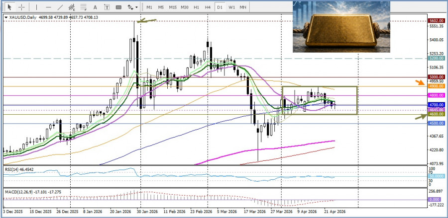 На фоне роста инфляционного давления техническая картина по золоту начинает ухудшаться, поскольку цене не удаётся закрепиться выше уровня $4800 долларов за унцию. Несмотря на удержание поддержки на уровне $4700 долларов, четырёхнедельная восходящая серия прерывается. На дневном графике формируется консолидационная структура.